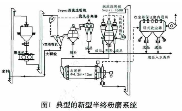 (4)隨著水泥粉磨工藝研究的不斷進步,對傳統聯合粉磨系統的不斷優化,“大輥壓機配小球磨機”的半終粉磨系統脫穎而出。與傳統聯合粉磨工藝系統相比,輥壓機半終粉磨工藝采用一臺物料處理能力較大的輥壓機和一臺喂料、分選能力大的下進風雙分離高效選粉機,將V選后的細粉再次進行分選,合格細粉從入磨前的物料中被分選出來并直接送入成品庫,中粗粉進入球磨機進行粉磨,大幅度提高了成品產量,改善了球磨機的工況,減少了過粉磨現象的發生。同時V型選粉機與雙分離高效選粉機共用一臺系統風機,取消了聯合粉磨系統中一臺循環風機與旋風收塵器及部分管道和輸送設備,進而提高了球磨機的綜合臺時產量,降低了粉磨電耗,減少了設備數量和維修成本。典型的新型半終粉磨系統如圖1所示。