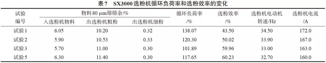 SX3000型選粉機系統循環負荷率和選粉效率對比見表7。
